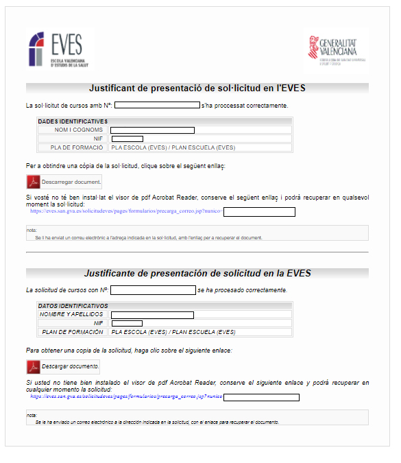 4. Si el sistema de registro de la EVES nos ha confirmado la inscripción, desde la siguiente ventana podremos imprimir o descargar el justificante de la presentación de la solicitud al curso. También recibiremos un correo electrónico con toda esta información.