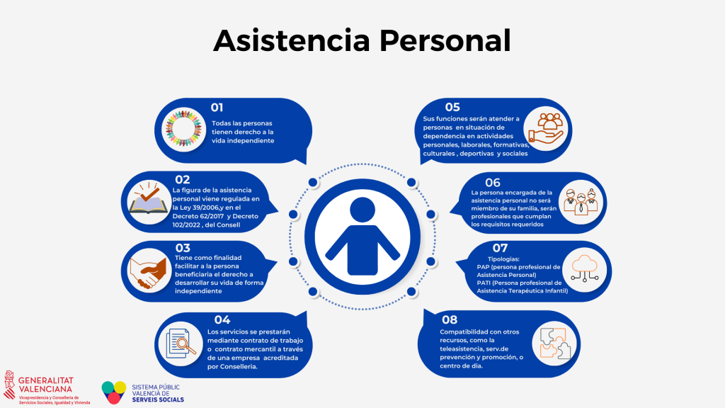 La Conselleria de Servicios Sociales tiene una página dedicada a la figura de la asistencia persona con toda la información, los pasos a seguir, requisitos, y un enlace al listado de empresas acreditadas para la prestación de la asistencia personal: