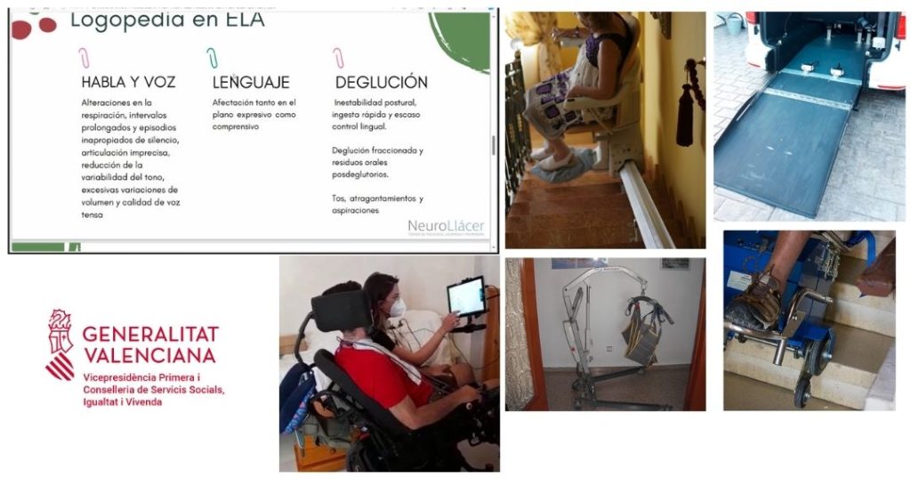 Para ello, contamos con los servicios de logopedia (ADELA-CV la ofrece de manera online) y la terapia ocupacional, que adapta el entorno del paciente y le enseña la utilización de las ayudas técnicas “in situ” tras haber realizado una valoración para determinar el momento y el tipo de ayudas. Además, enseña al paciente y la familia la manera correcta de realizar las trasferencias para evitar futuras lesiones, valora la utilización de productos de protección y propone actividades para que, mediante la actividad, la persona con ELA mantenga control respecto a las actividades y pueda contribuir a su realización.