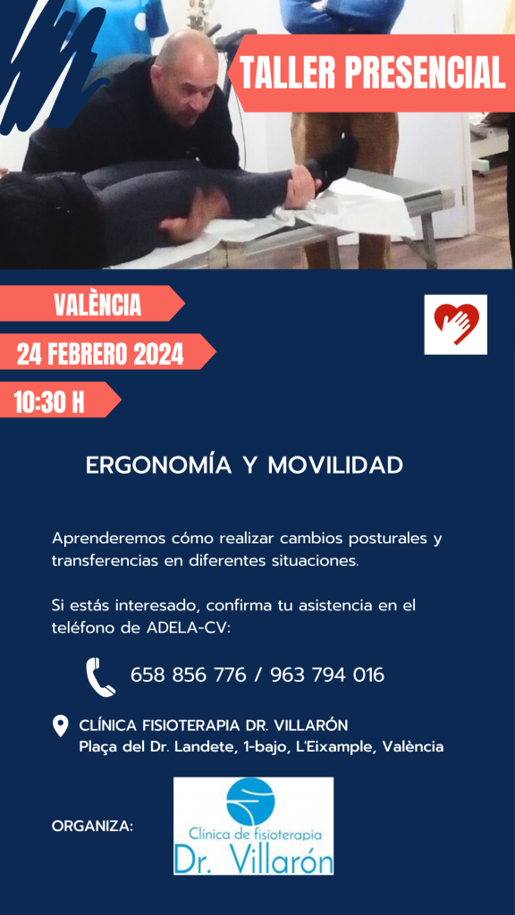 Aprender los principios básicos para realizar una correcta movilización manual de personas y evitar lesiones en el cuidador y cuidadora, así como del propio afectado/a, es el objetivo de este primer taller presencial organizado por la Clínica de Fisioterapia Dr. Villarón y que se realizará en sus instalaciones de València. El taller es gratuito y precisa inscripción contactando con ADELA-CV: